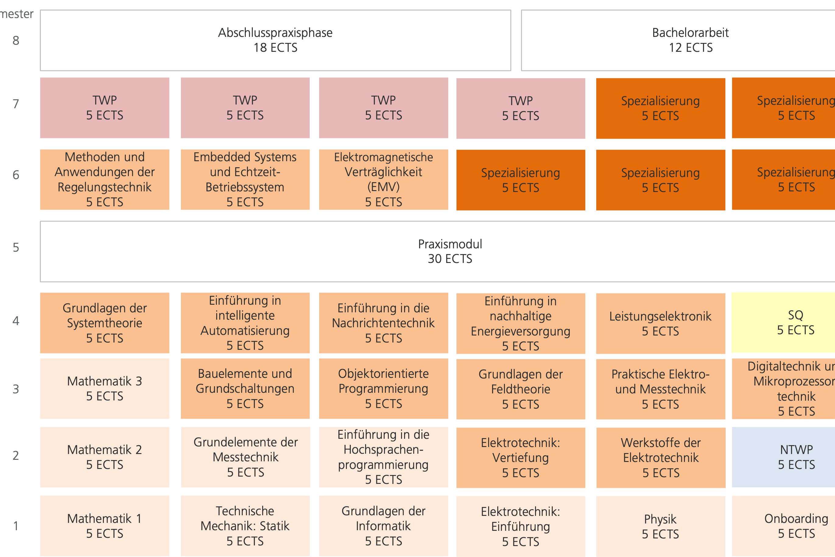 Der Studiengang richtet sich an technikaffine Personen, die eine praxisnahe und gleichzeitig wissenschaftlich fundierte Ausbildung suchen. In 8 Semestern und mit 240 ECTS erwirbst du fundierte mathematisch-naturwissenschaftliche und ingenieurwissenschaftliche Kenntnisse und spezialisierst dich in Bereichen Automatisierungstechnik, Nachhaltige Energiesysteme oder Nachrichtentechnik.