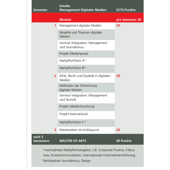 Die digitalisierte Medienwelt stellt Unternehmen vor neue Herausforderungen. Es besteht ein erhöhter Bedarf an Absolvent_innen, die sowohl über wirtschaftliche als auch technische, inhaltlich-konzeptionelle, gestalterische und methodische Kompetenzen verfügen. Der Masterstudiengang Management digitaler Medien stattet die Studierenden mit Schnittstellenkompetenzen aus, um in der digitalen Medienwelt Führungsaufgaben zu übernehmen. Der Studiengang ist anwendungsorientiert und befasst sich mit crossmedialen Anwendungen und Konzepten sowie mit Journalismus im digitalen Wandel.