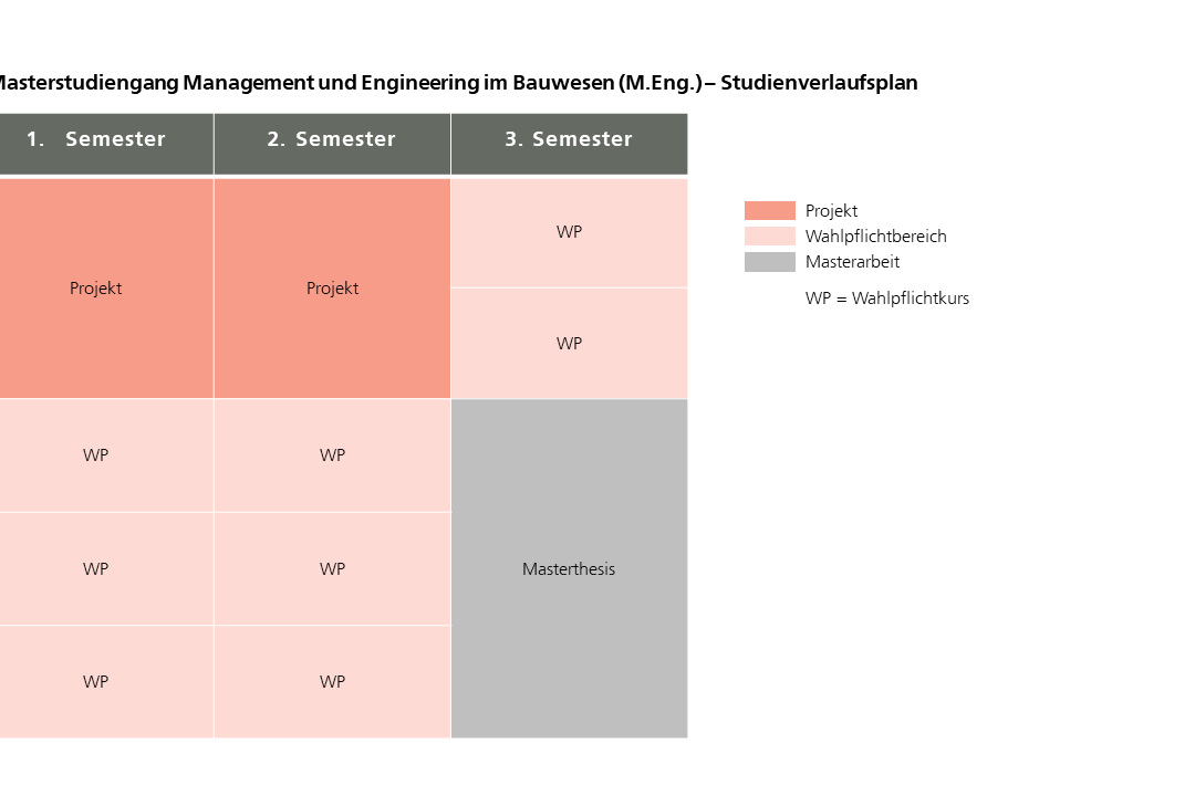 Das Modulangebot gliedert sich in die Kompetenzbereiche Management, Konstruktiver Ingenieurbau und Infrastruktur. Studierende müssen in den beiden Kompetenzbereichen, die sich aus der Wahl ihrer Studienrichtung ergeben, jeweils ein Master-Projekt und drei Wahlpflichtmodule abschließen. Die verbleibenden zwei Wahlpflichtmodule können Studierende aus dem Wahlpflichtangebot des Masterstudiengangs Management und Engineering im Bauwesen frei wählen.