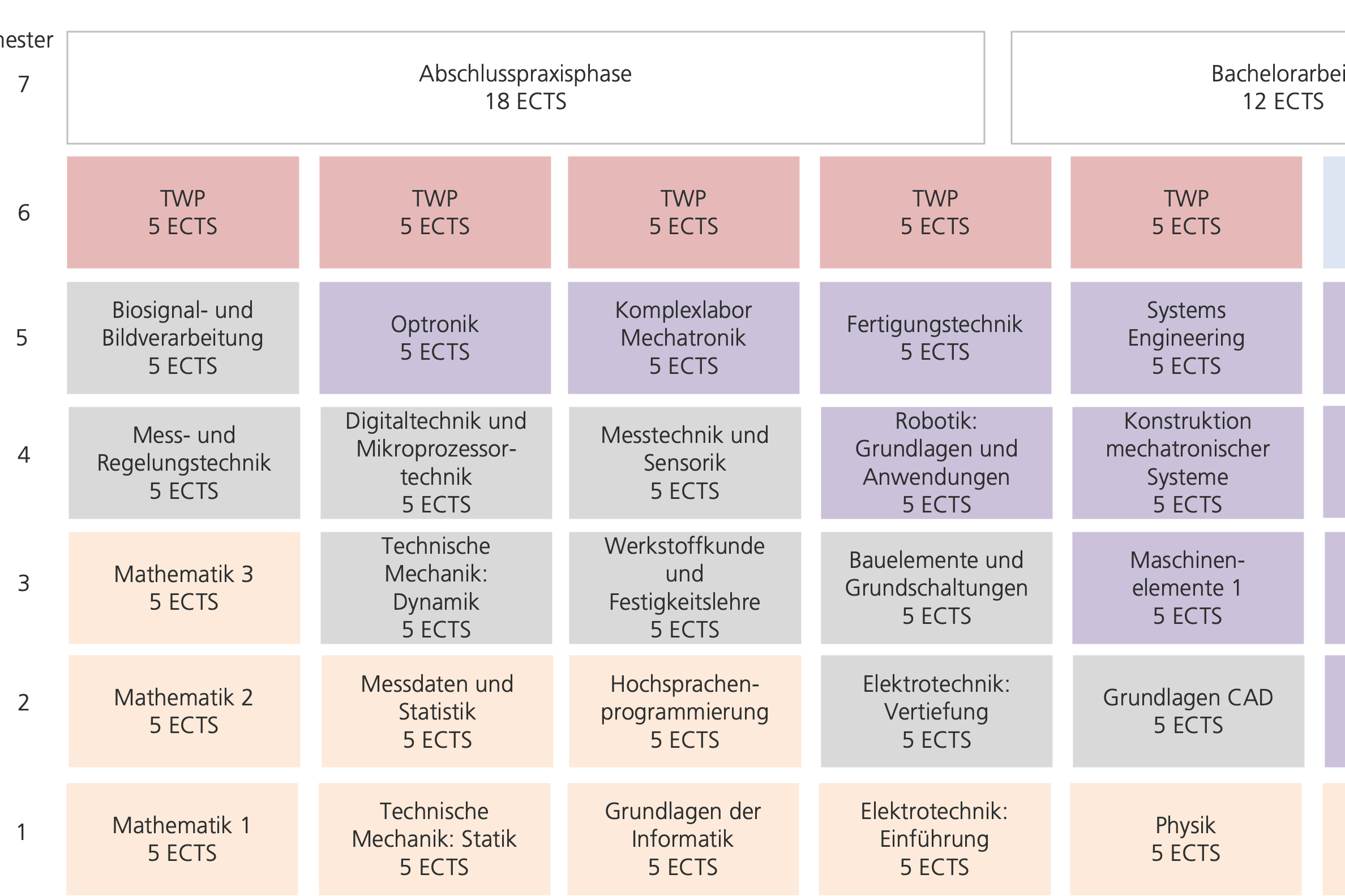 Der Studiengang richtet sich an technikaffine Personen, die eine praxisnahe und gleichzeitig wissenschaftlich fundierte Ausbildung suchen. In 7 Semestern und mit 210 ECTS erwirbst du fundierte mathematisch-naturwissenschaftliche und ingenieurwissenschaftliche Kenntnisse und spezialisierst dich in Aufbau, Steuerung und Vernetzung mechatronischer Geräte und Systemkomponenten.