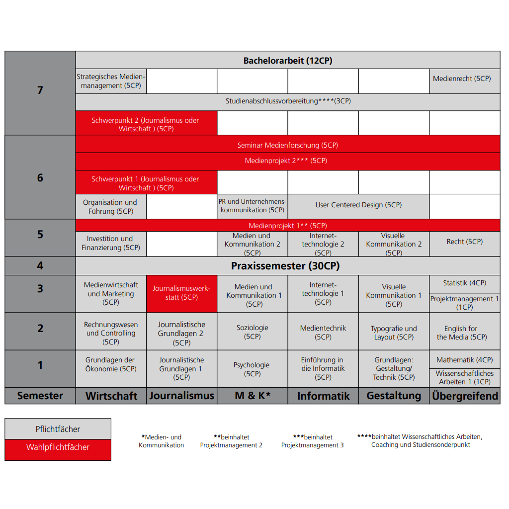 Sie können Module (bis zu knapp 30 Leistungspunkte pro Semester) aus den Bereichen Journalismus, Medienwissenschaft, Medienwirtschaft, Informatik und Mediendesign kombinieren. Dabei wählen Sie Module aus einem Angebot von mehr als 50 Leistungspunkten.