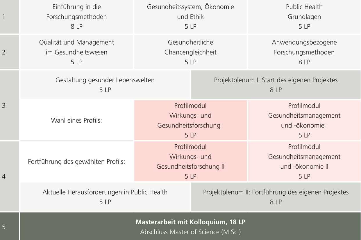 Den Masterstudiengang Public Health (M. Sc.) absolvieren Sie in fünf Semestern und erwerben 90 Leistungspunkte. Sie profitieren von einer forschungsorientierten Ausbildung mit klarem Praxistransfer und stärken zugleich Ihre Kompetenzen in der Zusammenarbeit multiprofessioneller Teams.