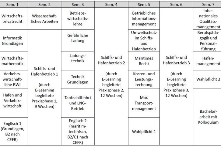 Das Studium Schiffs- und Hafenbetrieb berufsbegleitend am Fachbereich Seefahrt und Logistik der Jade Hochschule, vermittelt Studierenden Fach- und Schlüsselkompetenzen für zukünftige Positionen im mittleren Management in der Reederei- und Hafenwirtschaft und der Wasser- und Schifffahrtsverwaltung. Innerhalb von sieben Semestern erwerben Studierende den Abschluss als Bachelor of Science (B.Sc.).