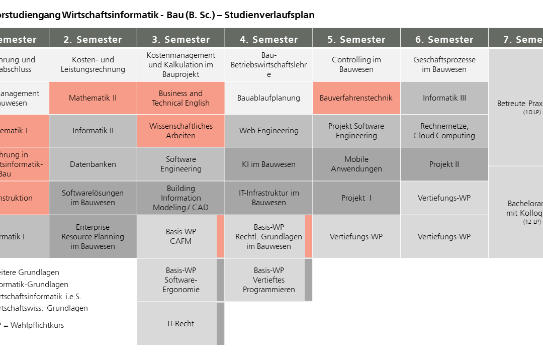 Als bundesweit einzigartiges Angebot qualifiziert der Studiengang Absolvent_innen dazu, fortschrittliche IT-Infrastrukturen für die Bauindustrie zu entwickeln, einzuführen und zu administrieren. Der Lehrplan ist auf aktuelle Entwicklungen und Bedarfe der Branche abgestimmt und schafft die fachlichen Voraussetzungen, digitale Transformationsprozesse in Bauprojekten sowie in Unternehmen – auch über die Bauwirtschaft hinaus – kompetent zu gestalten und zu steuern.