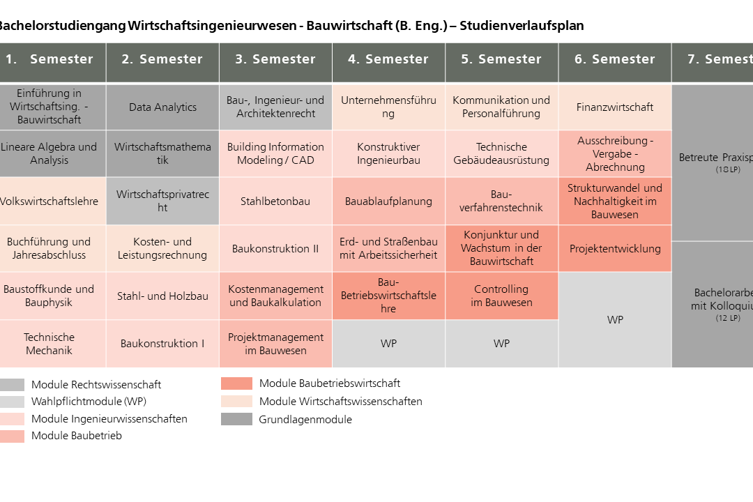 Der Studiengang Wirtschaftsingenieurwesen – Bauwirtschaft an der Jade Hochschule verbindet praxisnah technische Inhalte des Bauingenieurwesens mit betriebswirtschaftlichem Know-how. Studierende lernen, Bauprojekte fachlich, organisatorisch und wirtschaftlich zu steuern – von Baukonstruktion und BIM bis Rechnungswesen und Projektmanagement. Ein Praxissemester sowie die Bachelorarbeit vertiefen den Bezug zur Berufspraxis. Absolvent_innen qualifizieren sich für Tätigkeiten in Bauunternehmen, Ingenieurbüros, Verwaltung und Projektsteuerung, national wie international.
