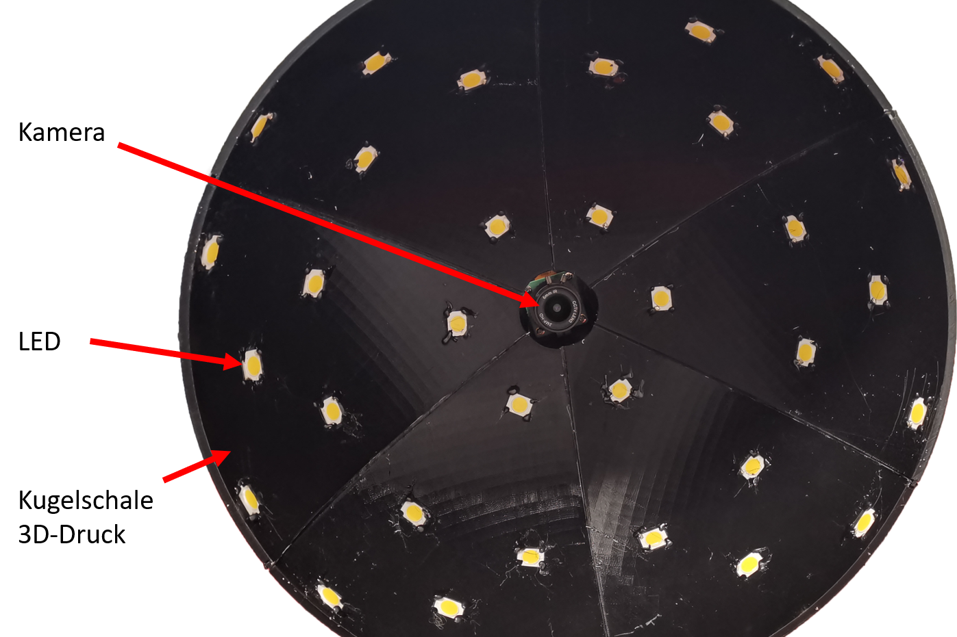 Der RTI-Dome verfügt über 36 einzeln steuerbare LEDs und eine Kamera, die mittig positioniert ist. Jede LED leuchtet nacheinander 1x kurz auf. Währenddessen wird jeweils ein Bild aufgenommen. Es entstehen also 36 Bilder mit jeweils unterschiedlicher Beleuchtung der Szene. Diese 36 Bilder lassen sich dann zu einem sog. RTI-Bild weiterverarbeiten. Das RTI-Bild erlaubt eine nachträgliche interaktive Steuerung der Beleuchtungsrichtung und eine spezielle Visualisierung, um kleine Unebenheiten und Fehlstellen im Objekt sichtbar machen zu können.