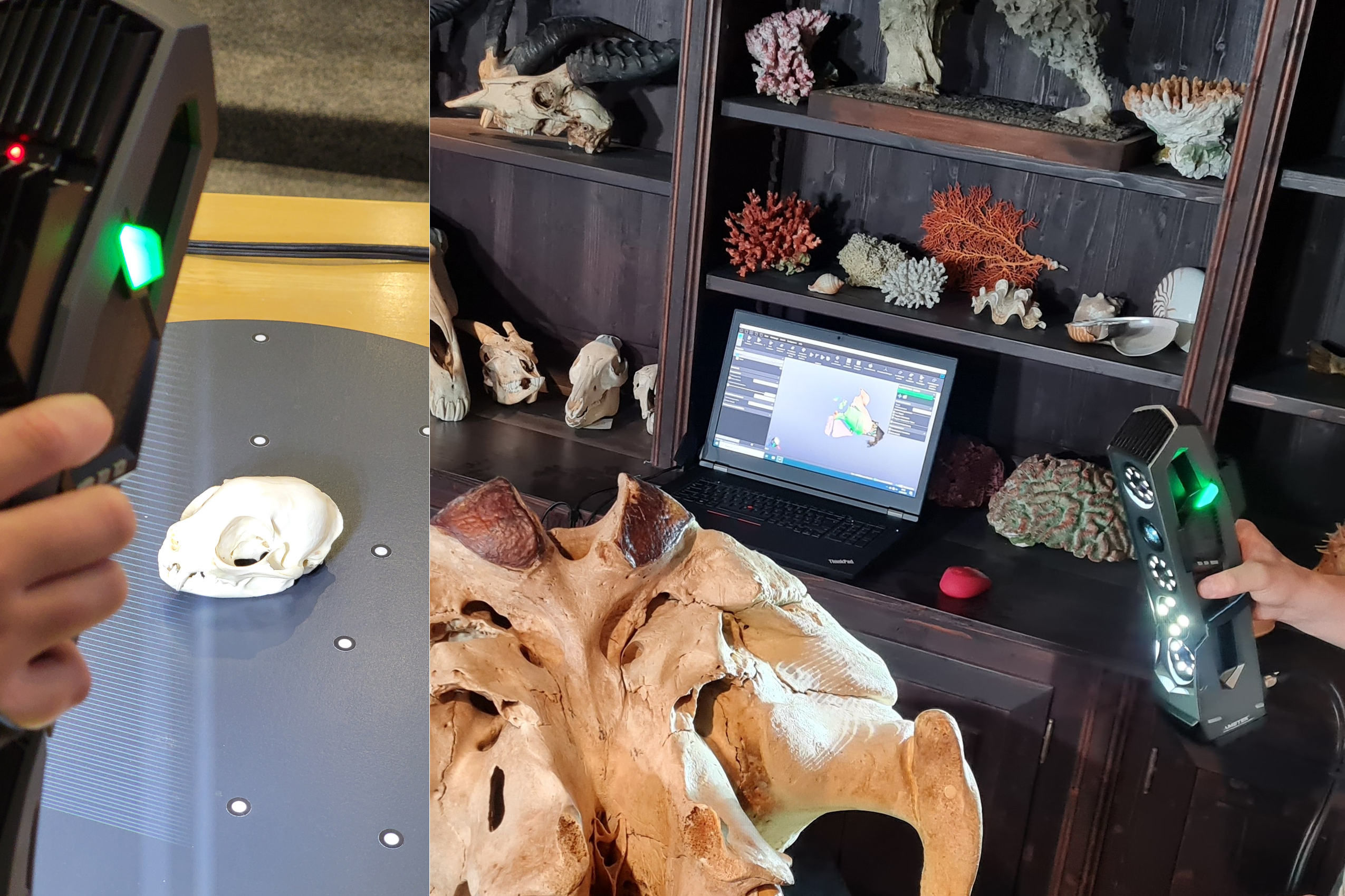 Mit einem Handscanner können wir z.B. Kulturgüter oder allgemein kleine Objekte in Echtzeit dreidimensional digitalisieren. Probiere unseren Handscanner selbst aus! Dieser projiziert Linien auf das Objekt. Drei Kameras nehmen diese Linien auf und über Bildverarbeitung und Mathematik können wir daraus das Objekt dreidimensional erfassen – und alles sehen wir direkt auf dem Monitor.