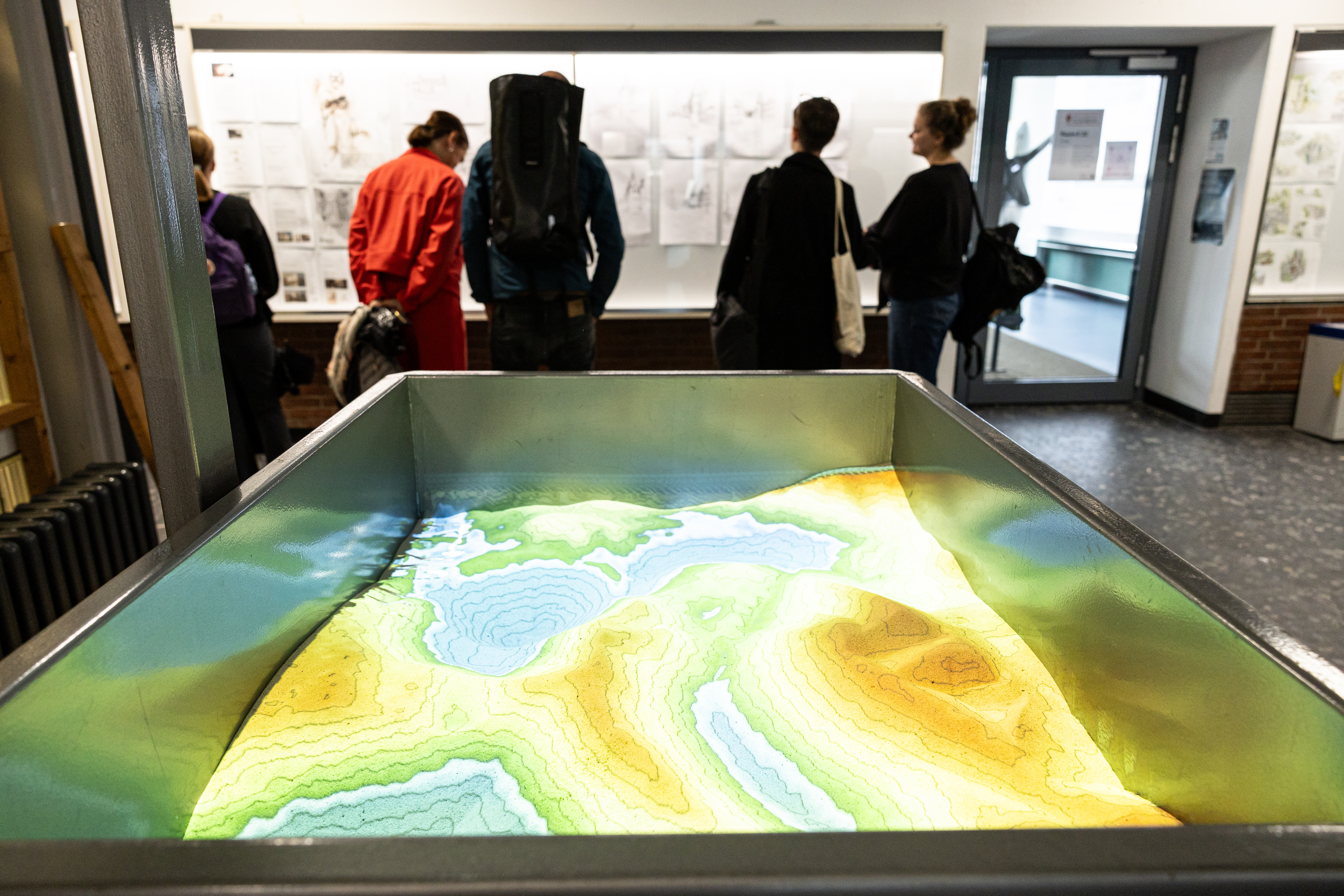 Gestalte neue Landschaften und erlebe die Faszination von Augmented Reality! Der Sand in diesem Exponat kann von Dir in immer neue Formen gebracht werden, wobei die Oberfläche erfasst und als digitales Geländemodell in Echtzeit wieder auf den Sand projiziert wird. Topographische Änderungen werden begreifbar und die Zusammenhänge zwischen der erfassten Oberfläche und der Visualisierung deutlich. Zusätzlich lässt sich die Realität um eine Wassersimulation erweitern.