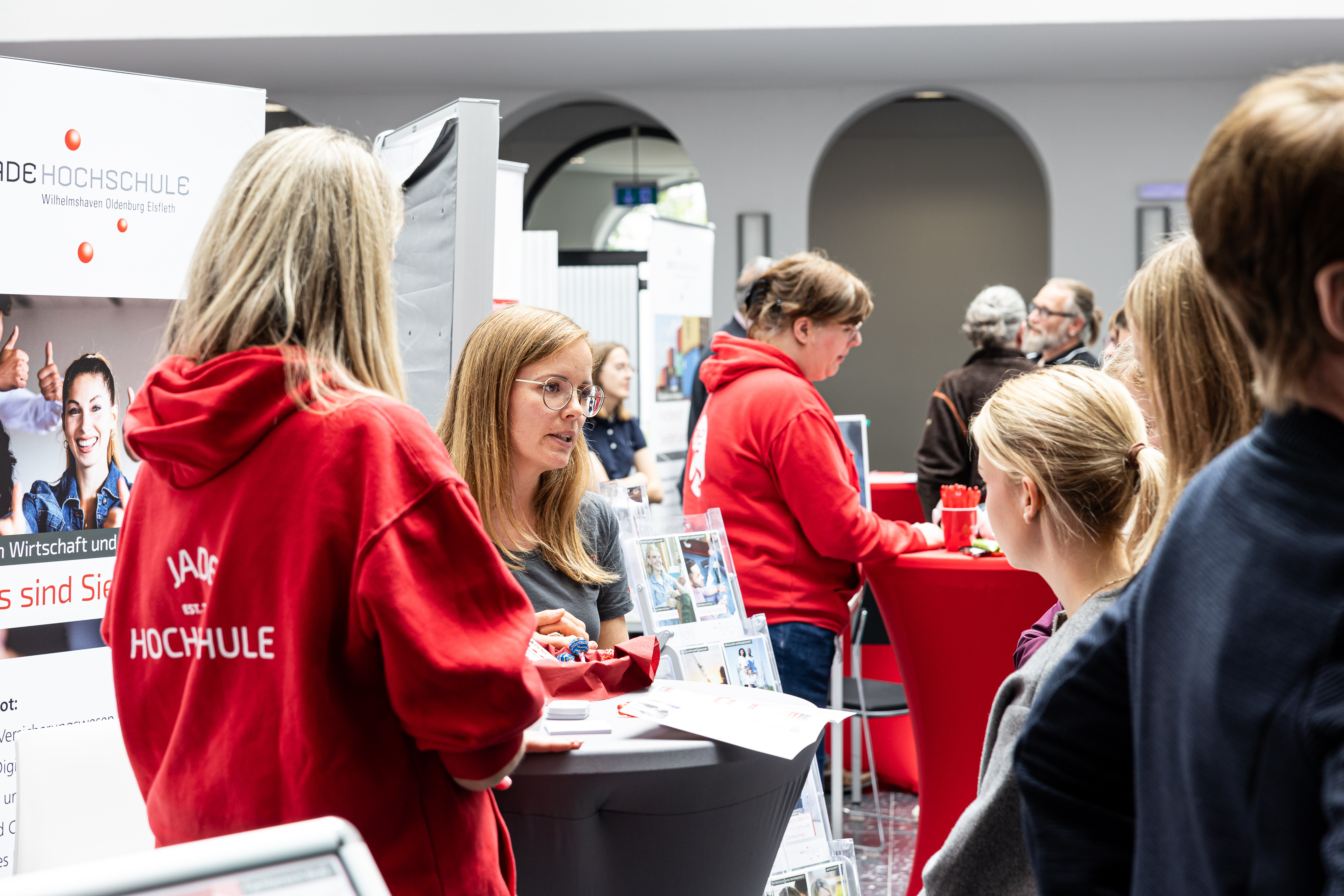 Auf dem Marktplatz im zentralen Lichthof und in den Fluren des Hauptgebäudes präsentieren sich alle Studiengänge und diverse zentralen Einrichtungen der Jade Hochschule mit Informationsständen.