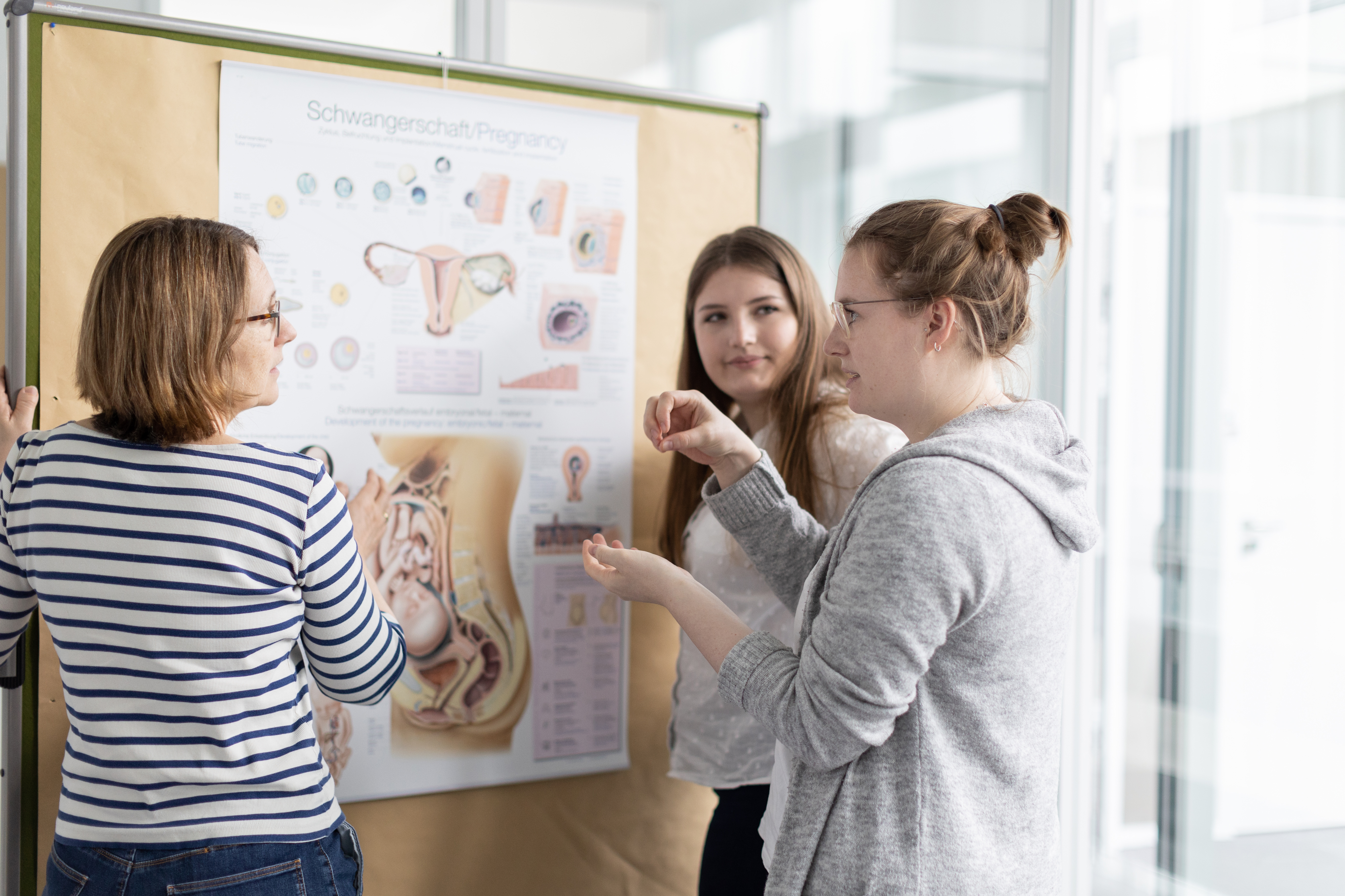 Bei uns können verschiedene Simulatoren, die wir im Bereich der praktischen Ausbildung nutzen, ausprobiert werden. Zum Beispiel kann die Lage eines Kindes im Bauch der Mutter ertastet werden und Herztöne gehört werden. In einem Wissensquiz kann das eigene Vorwissen für den Beruf der Hebamme getestet werden. Studierende des Studiengangs stehen für Fragen zum Studium ebenso zur Verfügung wie Lehrende aus dem Studiengang.