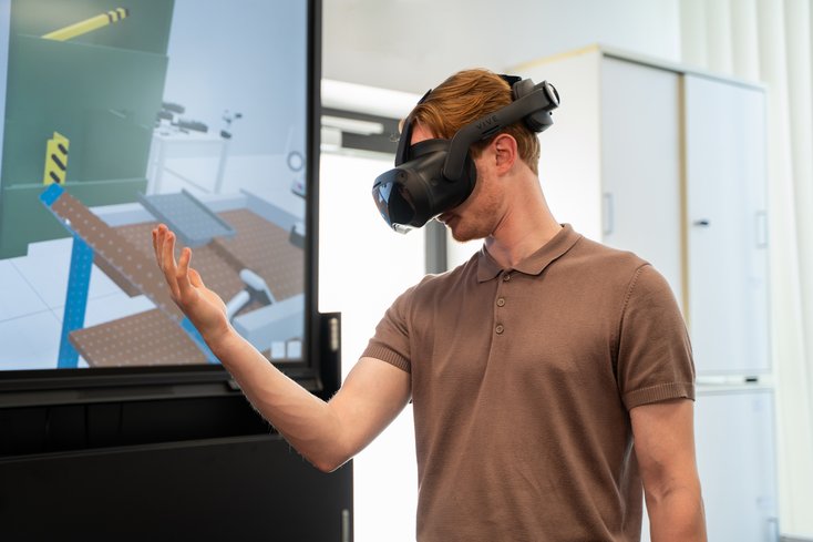 Im Logistiklabor betreiben wir zwei Virtual Reality (VR) Brillen. Studierende erstellen mit passender Software maßstabsgetreue 3D-Modelle von Lagerhallen, Regallagern oder Produktionshallen um sich in den virtuellen Realitäten mit der VR-Technologie bewegen zu können. Damit können sie Prozesse überblicken, testen und Optimierungspotenziale erkennen. Diese Technologie bietet innovative Möglichkeiten, um Effizienz und Sicherheit zu steigern. Studierenden können in realistischen, virtuellen Umgebungen geschult werden und verstehen komplexe logistische Prozesse ohne das physische Ressourcen oder Räume benötigt werden.