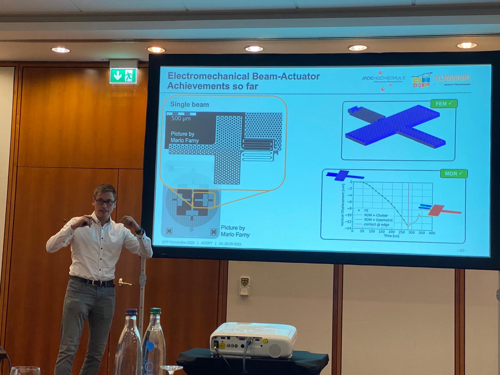 Im Rahmen des DFG-Schwerpunktprogrammes "KOMMMA" haben sich Wissenschaftler in der Goethe-Stadt Weimar getroffen. Dabei kamen Wissenschaftler von 18 Institutionen aus ganz Deutschland für zusammen. Neben Institutionen wie dem KIT und der TU Dresden war auch die Jade Hochschule vertreten. Ziel des Treffens war neben der Präsentation der aktuellen Ergebnisse auch der intensive Austausch innerhalb der Mikroaktrorik-Community. Vielfätige Mikrosysteme wurden diskutiert, von "Stimuli Responsive Polymers" über "Dielectric Elastomer Membranes" bis hin zu Mikro-Origami. Arwed Schütz und Prof. Dr.-Ing. Bechtold stellten im Rahmen ihres Projektes "ADOPT" neue multiphsyikalische Simulationen sowie fortschrittliche Techniken zur nichtlinearen Modellordnungsreduktion vor. Gastvorträge von Prof. Dr. Andreas Richter (TU Dresden) und Jun.-Prof. Dr. Edoardo Milana (Albert-Ludwigs-Universität Freiburg) erweiterten den fachlichen Horizont. Eine Stadtführung in Weimar und ein Besuch im Goethe Nationalmuseum rundeten die Zusammenkunft ab.