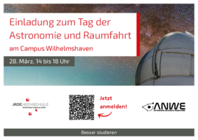 Erstmalig findet in diesem Jahr der "Tag der Astronomie und Raumfahrt" an der Jade Hochschule in Wilhelmshaven statt. Die Jade Hochschule am Studienort Wilhelmshaven ist Sitz des Astronomie-Netzwerks Weser-Ems (ANWE), einem Verbund aus fünf Hochschulen, den Deutschen Zentrum für Luft- und Raumfahrtt. elf astronomischen Vereinigungen sowie einer astronomischen Stiftung.